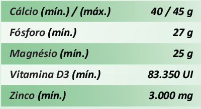 Indicação de Uso: Calmax® é um suplemento que contém uma combinação ideal de minerais importantes, como Cálcio, Fósforo, Magnésio e Zinco, associados a vitamina D3. Para mamíferos de forma geral, a suplementação de cálcio é importante na fase de lactação, para o correto desenvolvimento dos ossos dos filhotes, contendo os principais elementos para o crescimento ideal dos animais e para auxiliar na reposição das matrizes ósseas durante a velhice. Auxilia, também, para saúde muscular de animais atletas ou de trabalho e contribui para a manutenção da saúde dos cascos e unhas em espécies como, Equinos, Muares, Asininos, Bovinos, Suínos e Aves.